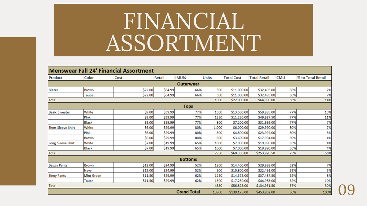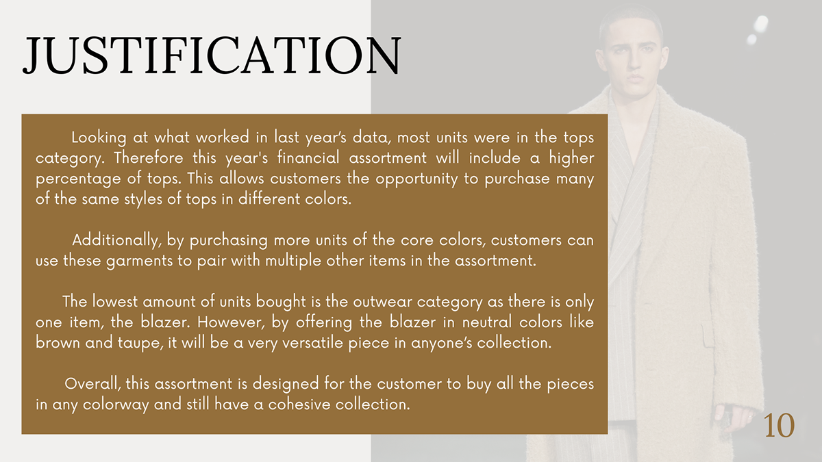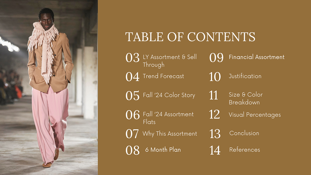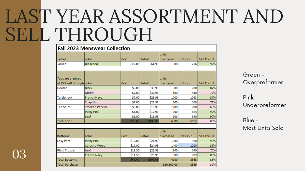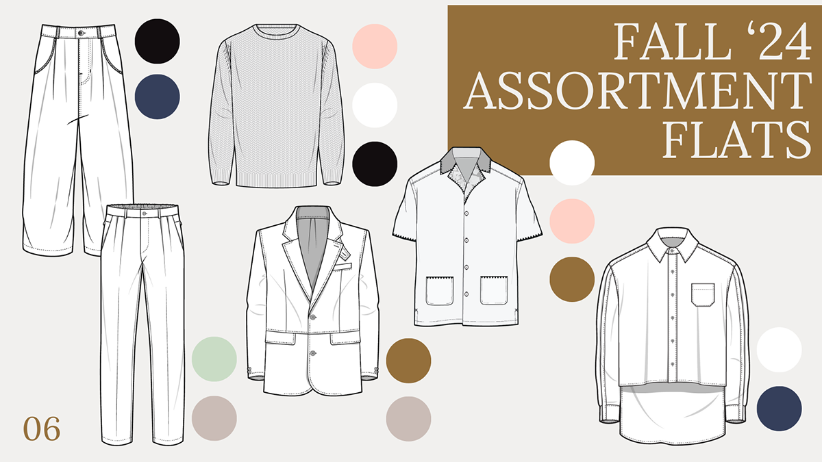 A menswear assortment project including trend forecasting, color strategy, financial planning, and sell-through analysis.