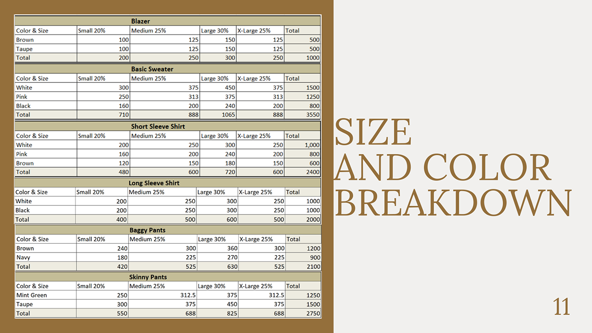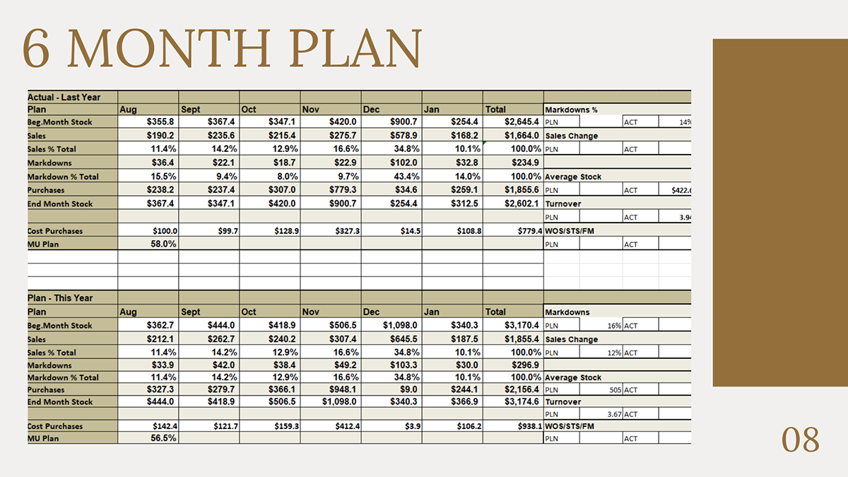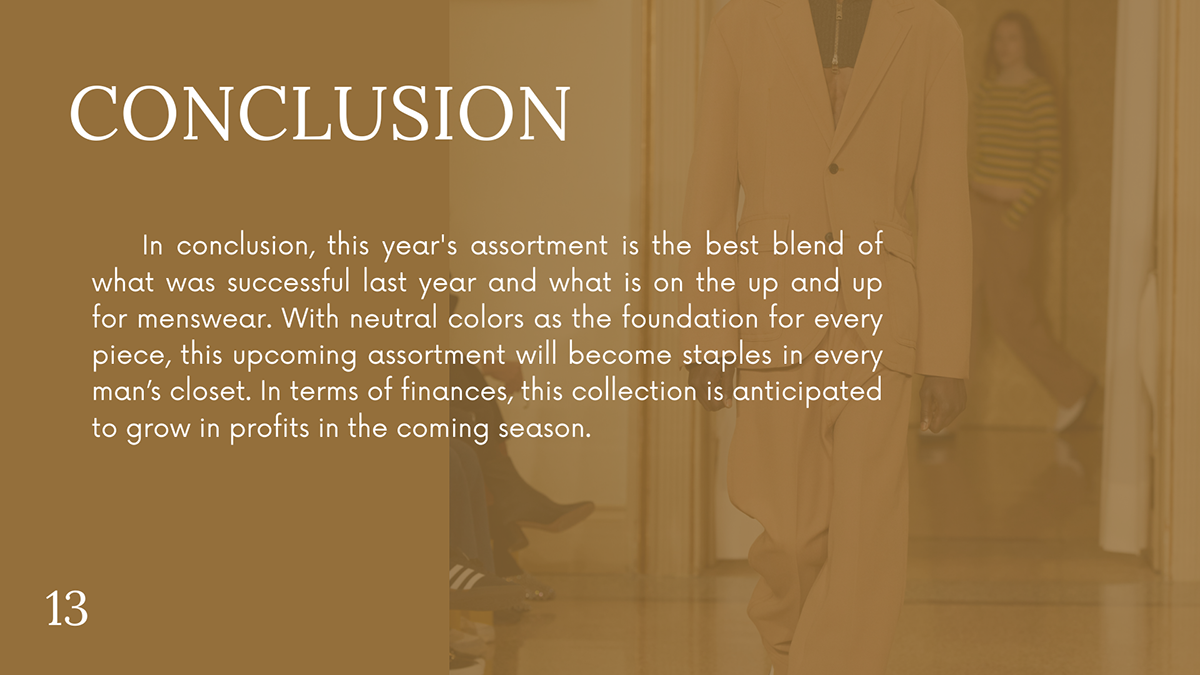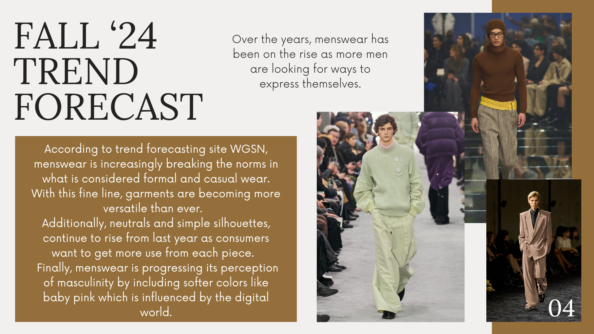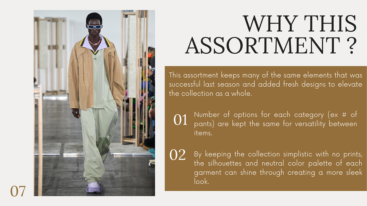 A menswear assortment project including trend forecasting, color strategy, financial planning, and sell-through analysis.